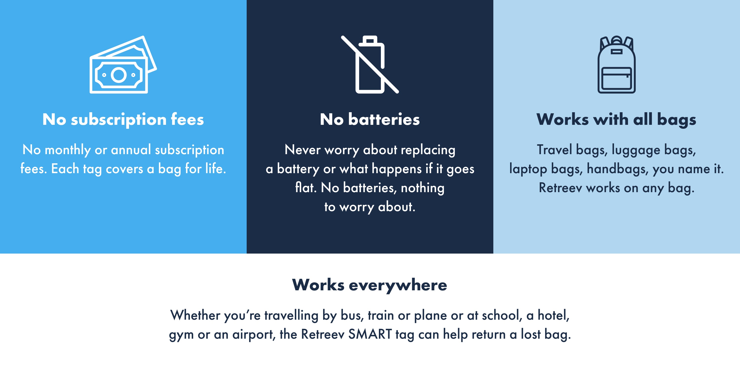 The Retreev Smart Tag instantly notifies you via email and text with vital recovery information as soon as your lost item is found.